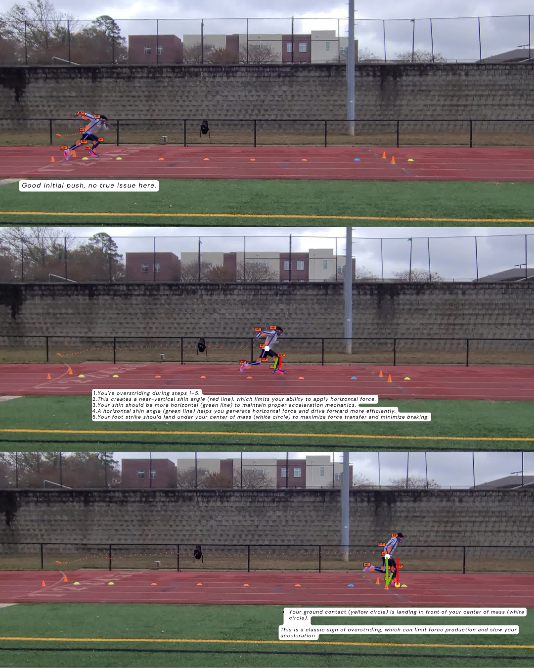 Actionable corrections and cues based on your video submission, tailored to help you improve acceleration efficiency and maximize performance.